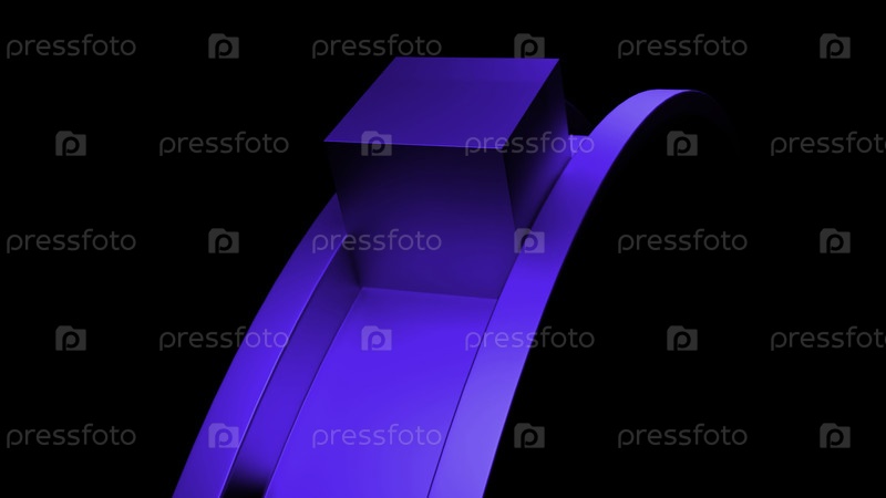 Куб едет по круговой дороге на черном фоне.Дизайн.Геометрический сюрреалистический рисунок