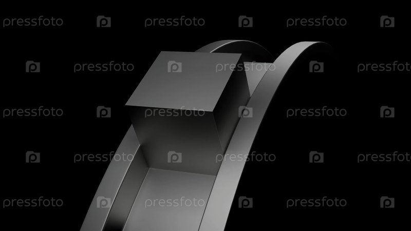 Куб едет по круговой дороге на черном фоне. Дизайн. Геометрический сюрреалистический узор