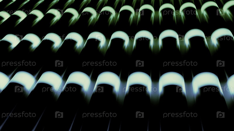 Абстрактные градиентные лампочки длинной формы, движущиеся вниз на черном фоне. Дизайн. Зеленые и светло-синие огни в темноте