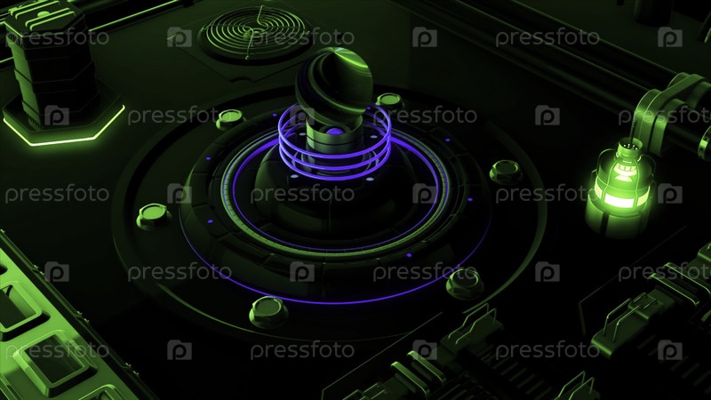 Контрольная панель корабля или самолета с красивыми абстрактными светящимися деталями.Движение.Закрытие работающего абстрактного механизма