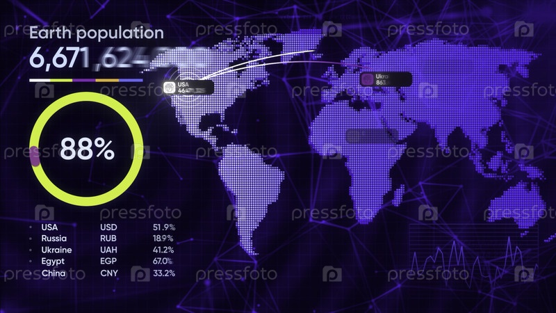 Технологическая карта мира со статистикой. Движение. 3D графическая карта мира и числовые значения. Население Земли на карте мира с числами