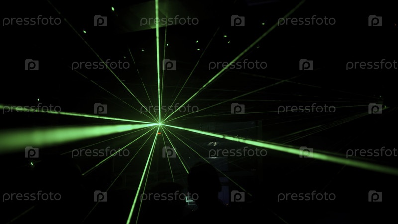 Зеленые лазерные лучи на подсветке рядом с диджеем и танцующими людьми