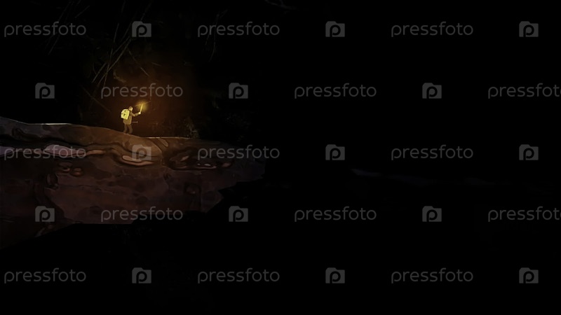 Абстрактная мультфильмовая анимация с храбрым человеком с факелом в лесу.Сцена.Человек, проходящий через препятствия в опасном лесу