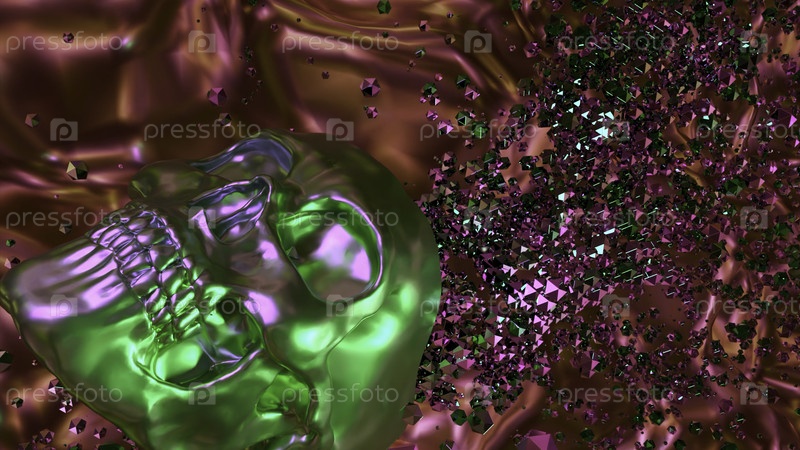 Стильная анимация с 3D-черепом. Дизайн. Красочная 3D-анимация с черепом и взрывным потоком частиц. Поток 3D-частиц, когда паразиты выходят из черепа. Поток мыслей с черепом в красочной абстрактной анимации