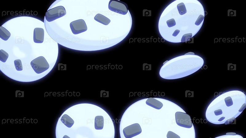 Многие голубые неоновые круглые печенья с шоколадными чипсами, вращающимися и падающими на черный фон