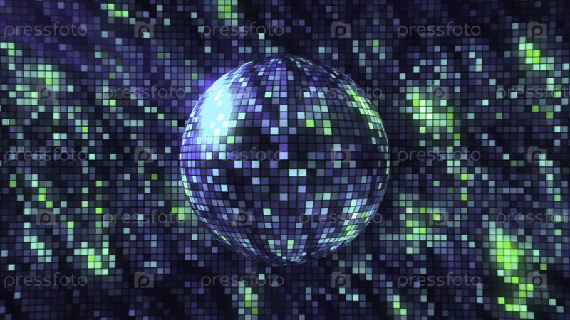 3D фиолетовый и зеленый сферический объект, покрытый танцевальными плитками дискотеки, вращающимися на красочном фоне
