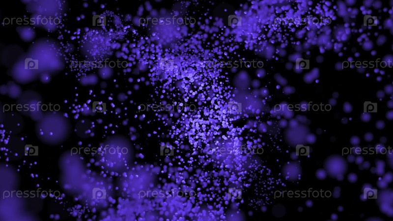 Частицы собираются в потоке. Дизайн. Цветные частицы перемещаются в одном потоке в пространстве. Частицы передвигаются в рою в потоке на черном фоне