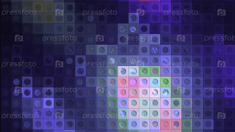 Мозаичный фон квадратов с меняющимся цветом. Движение. Перемещающиеся цвета на поверхности мозаичных квадратов. Фон многих квадратов с точками, изменяющими цвет
