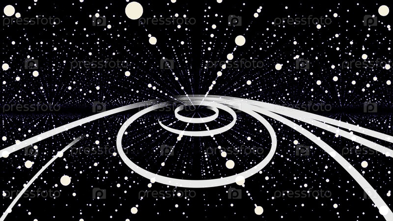 Абстрактный фон с белыми узкими линиями и точками, движущимися на черном фоне, монохромный. вращающиеся круги светящегося света, бесшовная петля