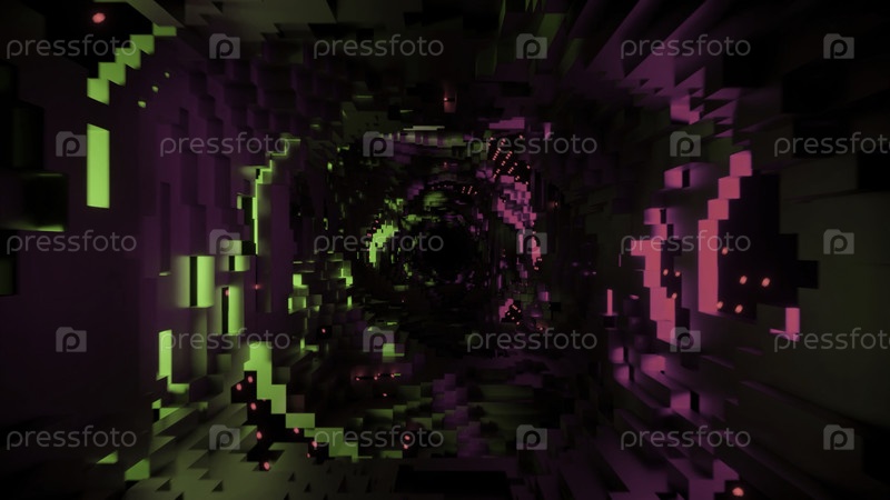 Абстрактный подземный руины туннеля с летающими кирпичами. дизайн. темный подземный тоннель с зеленым и розовым неоновыми огнями