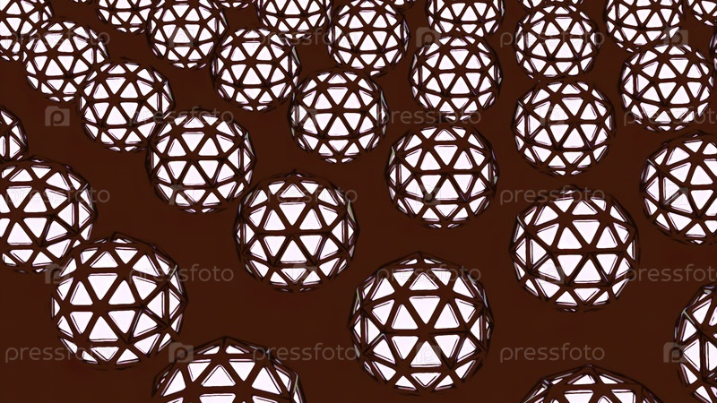 Фон с вращающимися шарами и сеткой. Дизайн. Геометрическая решетка на вращающихся шарах в анимации. Много вращающихся шариков со сетью на цветном фоне