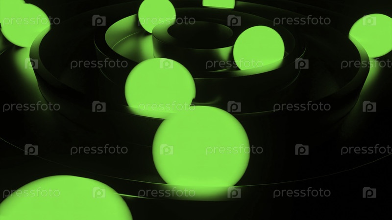 Светящиеся шары, вращающиеся в кольцах. Дизайн. Сверкающие шарики перемещаются через кольца во тьме. 3D спиральные колеса с движущимися шарами