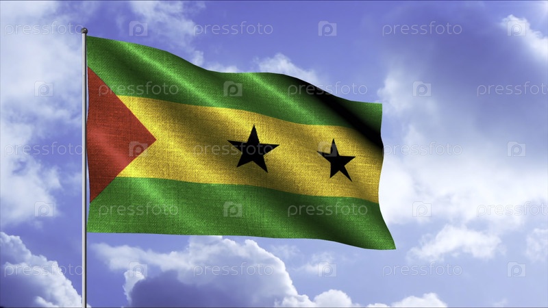 Флаг Сан-Томе и Принсипи.Движение.Основные цвета флага - зеленый, желтый, красный и черный.На ткани флага три горизонтальные полосы и две черные звезды