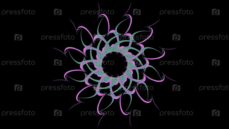 Цветочный цветный рисунок, вращающийся на черном фоне. Анимация акций. Абстрактный цветочный рисунок из красочных изогнутых линий, вращающихся на черном фоне