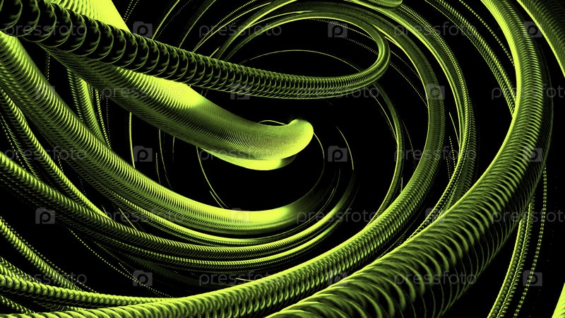 Случайные оптические волокна сплетены в большую спираль, 3D эффект. Дизайн. Металлические провода скручиваются на черном фоне