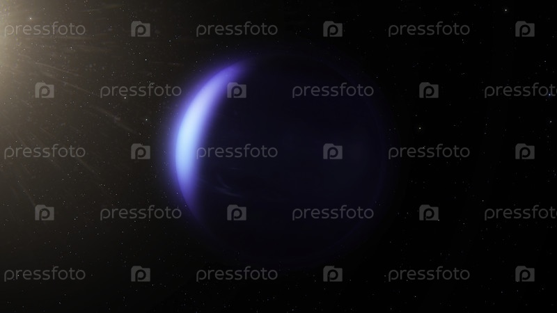 Вид на реалистичную атмосферу космоса, мерцающие звезды и медленно вращающуюся планету, освещенную солнцем с левой стороны