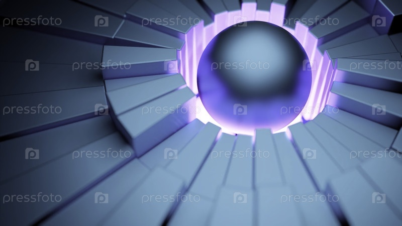 Абстрактное вращение металлических блоков вокруг сферы. дизайн. вращающиеся 3D-фигуры вокруг металлического шара