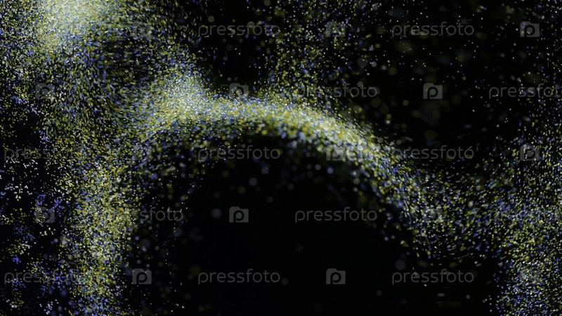 Анимация вихря цветной пыли.Анимация.Потоки пыли набухают на черном фоне.Цветовая пыль движется как водоворот, словно намагниченная