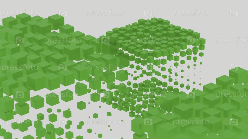 Кубы движутся по воздуху. Дизайн. Цветные кубы в виртуальном пространстве двигаются вверх и вниз. Кубы разных размеров перемещаются в невесомости на белом фоне