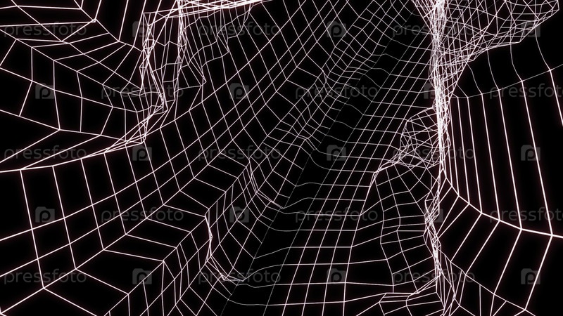 Темный фон. Дизайн. Яркий розовый коридор из паутины в абстракции, который качается и движется