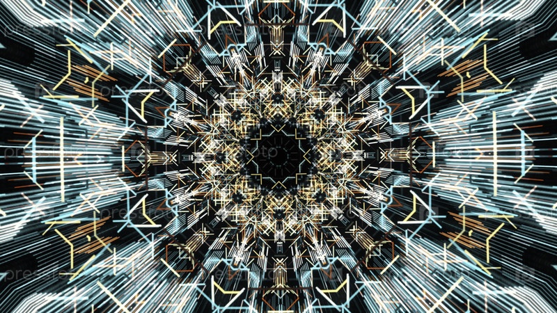 Гипнотическая абстрактная анимация голографического тоннеля с неоновыми геометрическими узорами, медленно движущимися на черном фоне