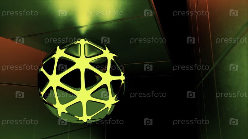 Абстрактная сфера с светящейся зеленой и желтой решетчатой структурой, освещающей темный футуристический фон