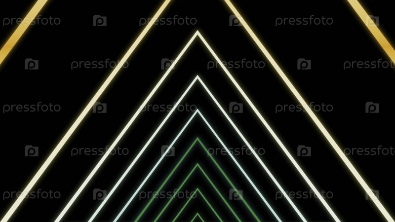 Неонные треугольные линии передвигаются на черном фоне. Дизайн. Централизованный движущийся туннель трехугольных линий. Треугольный тоннель неоновых линий