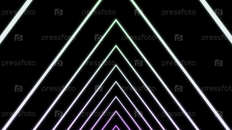 Летающий внутри меняющегося цвета тоннель, сформированный неоновыми линиями, бесшовная петля. Дизайн. Абстрактный коридор расширяющихся треугольных силуэтов на черном фоне