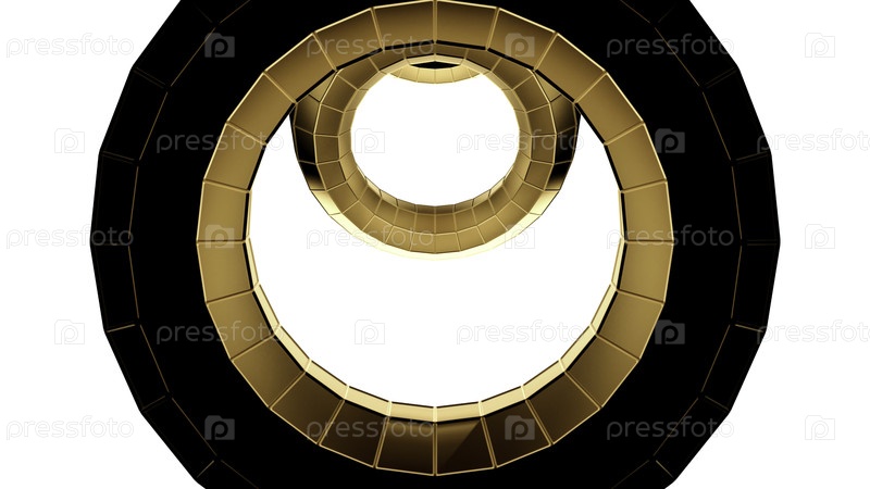 Текущие золотые металлические кольца одинакового размера на белом фоне. Дизайн. Технологический туннель круглой формы, бесшовная петля