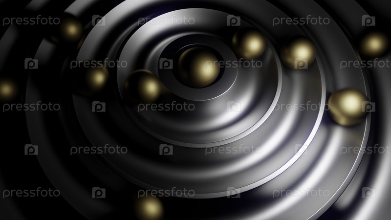 Деликатный серый фон с качающимися шарами. Дизайн. Золотые 3D-шары, прогуливающиеся по лабиринту, выполненные в мультфильме анимации. Высокое качество 4k кадров