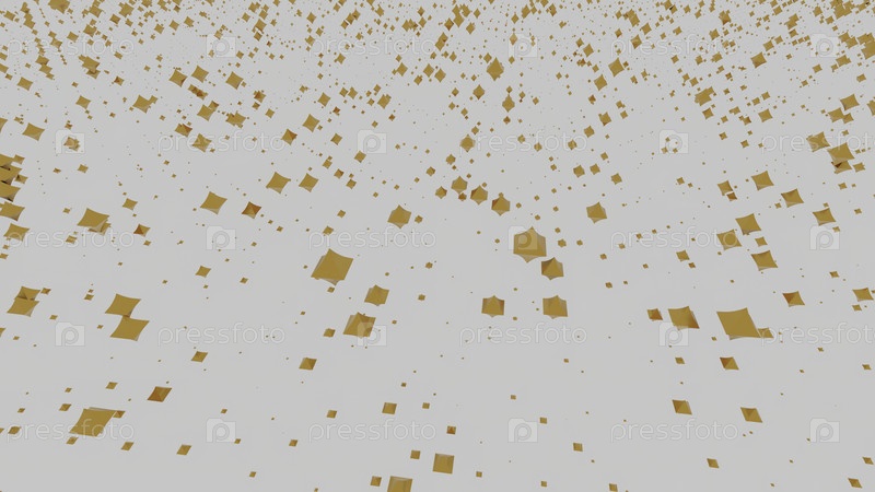 Виртуальное поле с квадратными движущимися волнами. Дизайн. Золотые квадраты перемещаются по волнам в пространстве. Поле частиц, двигающихся по волнам на белом фоне