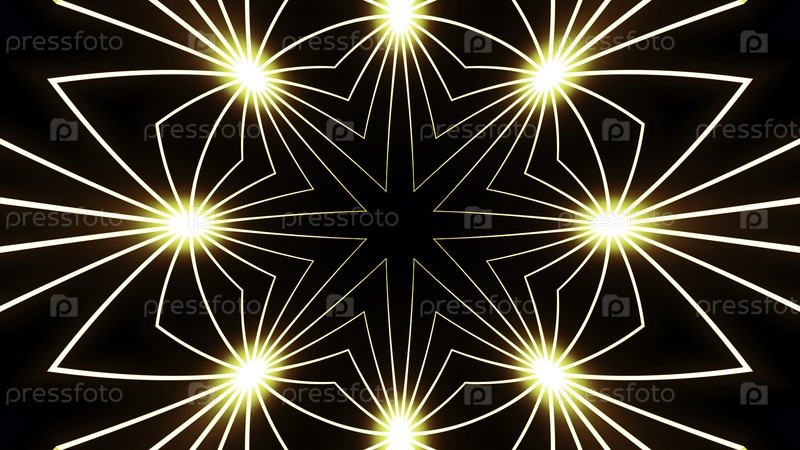 Мигающий цветочный рисунок с яркими вспышками. Анимация. Красивый рисунок линий движется и мигает на черном фоне. Яркие светящиеся огни в движущемся рисунке линий