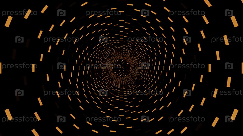 Черный фон.Дизайн.Оранжевый и фиолетовый свет, который создает туннель в абстракции, подчеркивающий стены квадратов и в конце которого мерцают частицы