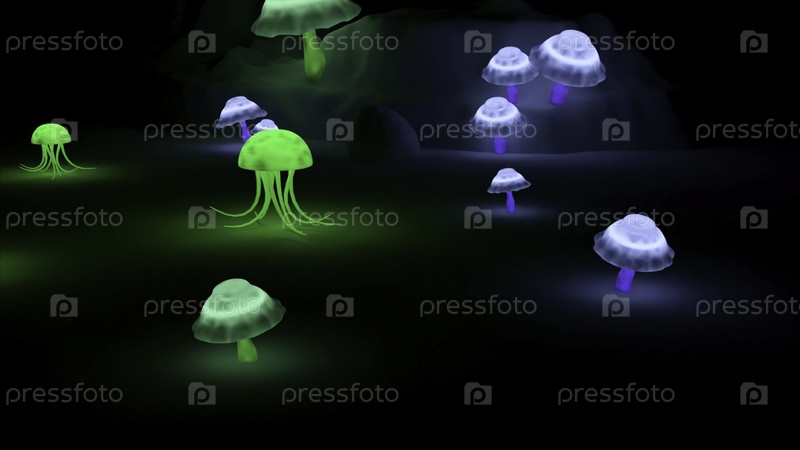 Психоделическая анимация с неоновыми грибами. Дизайн. Анимация с движущимися медузами и неоновыми грибами на черном фоне. Двигающиеся неонные грибы. Психоделические препараты