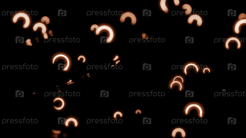 Скачущие крошечные аркуированные неоновые формы на черном фоне. Дизайн. Маленькие частицы, падающие из пузырей