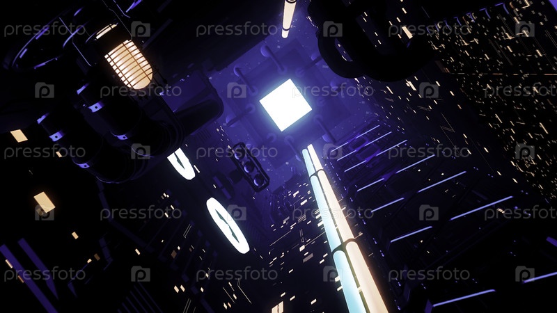 Инопланетный футуристический интерьер космического корабля с мерцающими огнями, бесшовной петлей. Движение. Научно-фантастический темный коридор со светом в конце туннеля