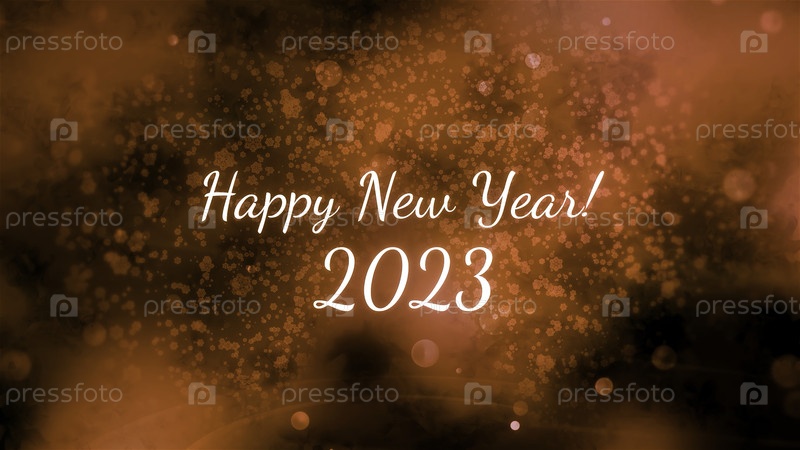Анимация слов Счастливого Нового 2023 года белыми буквами с оранжевым дымом и искрами. Движение. Концепция зимних каникул и праздников