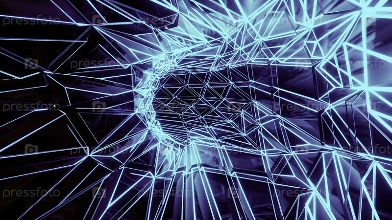 Пролетая через светящиеся неоновые линии, создавая туннель, бесшовную петлю.Дизайн.Синий бесконечный коридор