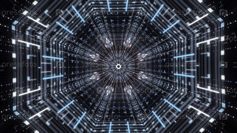 Красивая футуристическая абстракция бесконечного научно-фантастического тоннеля на черном фоне, движущийся вперед внутри светящихся линий флуоресцентного неона