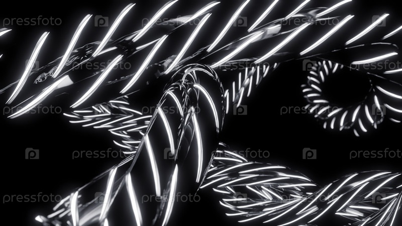 Абстрактная изогнутая неоновая монохромная веревка на черном фоне.Дизайн.Серебряные металлические веревки с белыми неонными полосками
