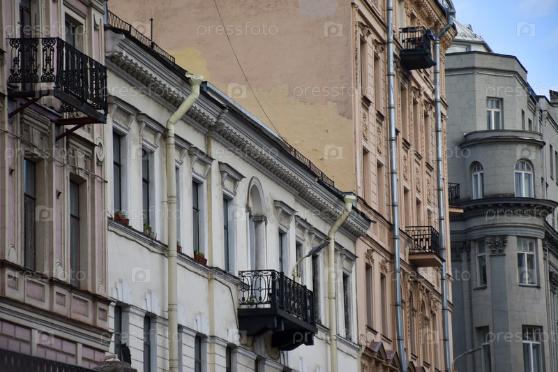 Исторические фасады жилых домов с коваными балконами и водосточными трубами, архитектура Санкт-Петербурга