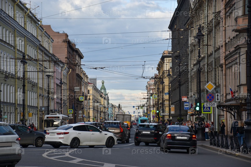 Оживленное движение транспорта на Невском проспекте на фоне исторической архитектуры Санкт-Петербурга
