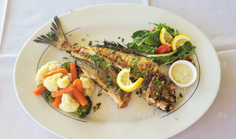 Зажаренная рыба дорадо с овощами, свежим салата и лимоном на белой тарелке. Вкусная и здоровая еда как для детей, так и для взрослых. Диетическое блюдо. Наряду с рыбой подают жареные овощи