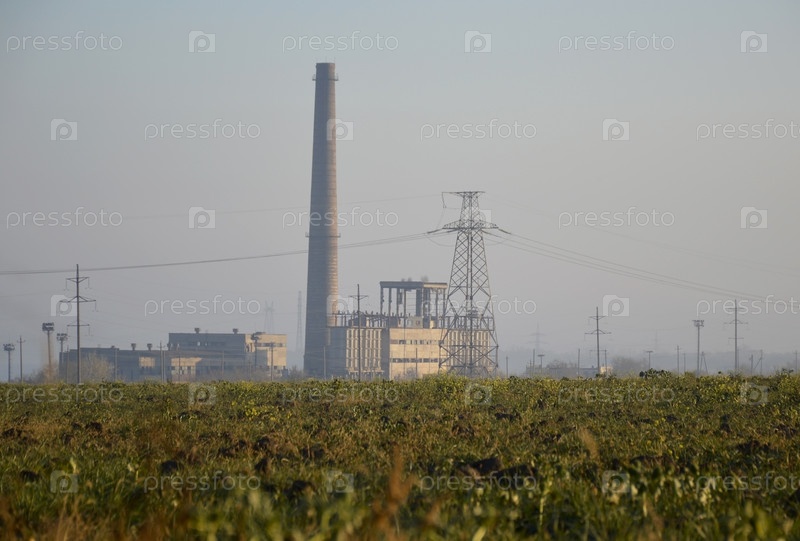 Электростанция в лучах солнца на рассвете. здания, линии электропередач и трубы промышленного объекта слегка скрыты туманной дымкой. производство электричества. выбросы газа и загрязнение воздуха