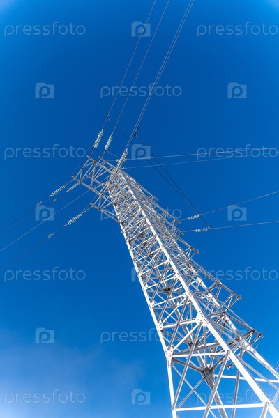 Низкий угол изображения белого стального электропередающего столба на ярко прозрачном голубом небе.Минималистский промышленный снимок с сильными геометрическими линиями и отрицательным пространством
