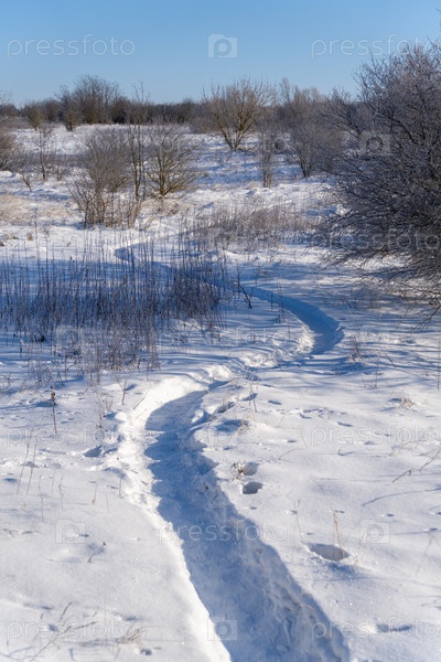 Извилистый путь, высеченный в глубоком снегу на покрытом морозом поле под чистым голубым небом. Спокойный зимний пейзаж, показывающий тропу через холодную, заснеженную природу в яркий солнечный день