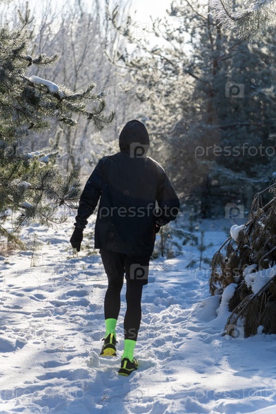 Бегущий в черном куртке, бегающий по снежной лесной тропе под зимним солнцем. тренировка на открытом воздухе, тренировки при холодной погоде, обзор сзади на морозной природной дорожке