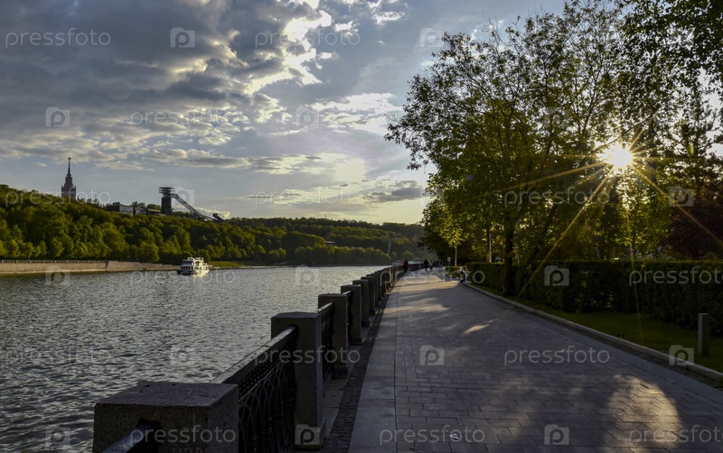 Живописная набережная в Москве, в Лужниках, на которой можно увидеть неспешно плывущую по воде лодку в обрамлении пышной зелени и яркого заката. Эта сцена подчеркивает спокойствие и естественную красоту городской среды