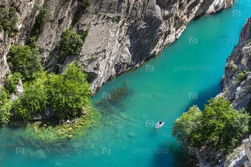 Бирюзовая река в горном каньоне и лодка на переправе
