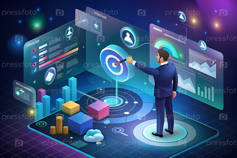 Стратегия цифрового маркетинга и таргетинг аудитории, концепция анализа данных.Человеческое взаимодействие с панелями управления аналитикой данных